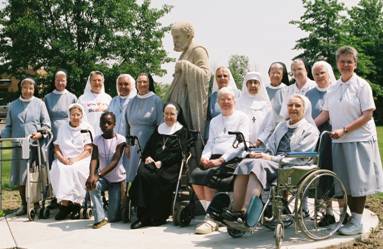 The Sisters on their “South of the Border” Vacation were the first to surround the statue to have their picture taken. Also, included in the picture is Faustina, the young girl from Haiti, who was recovering from heart surgery. No Archival documentation could be found in reference to when the original statue was actually mounted over the front door of the hospital on Broadway, nor what the actual date was for the move to the convent garden at the new Hospital on Madison. |
